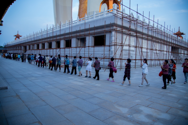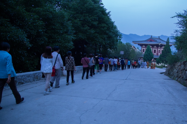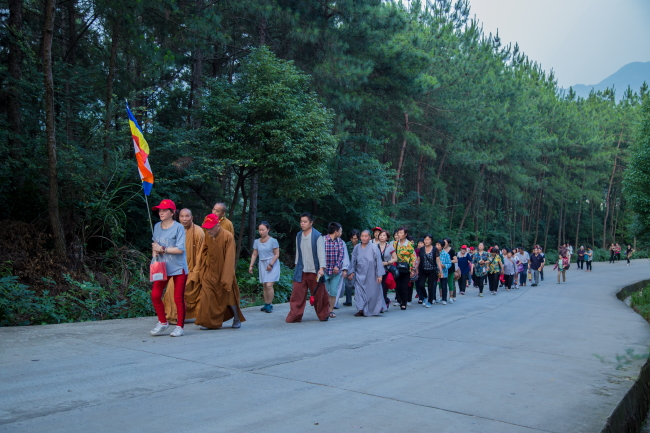 晚7点半,参礼团绕佛三匝后唱念佛号列队下山。大家欢喜踊跃,法喜充满。