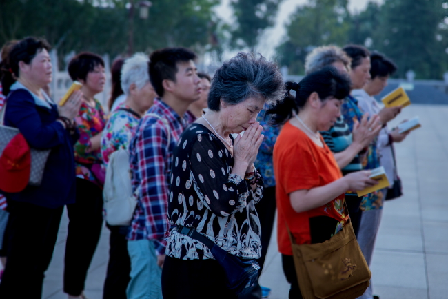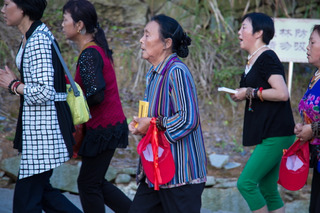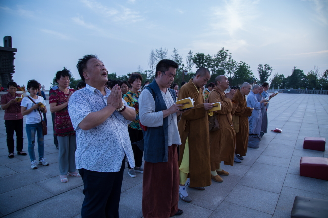 参礼团员仰望着大佛,口中唱念佛号从东门沿着山路一路向上。虽然经过一天的舟车劳顿且晚饭未进,这支平均年龄超过50岁的礼佛团队依旧干劲十足,不多时便走到了拜佛台。亲眼目睹大佛的雄伟身姿让不少人激动不已,纷纷匍匐在地向佛顶礼。列队完毕后,众人手捧经书在大佛脚下齐诵《忏悔文》,情至深处不禁潸然泪下。
