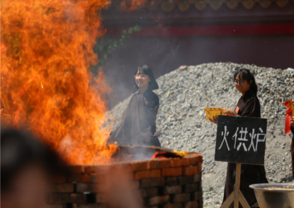下午2:00点,随着法鼓擂响,夏令营学员和四众弟子在衍天法师的率领下,以恭敬虔诚之心,按照慈悲施食仪轨如法共修。施放甘露法食,利济十方法界六道群灵,仗凭佛力荐拔在六道的众生。凭借三宝加持,大众讽诵经咒,直示唯心法要,令群灵受持三皈,礼佛拜忏,闻法受食,同得解脱。