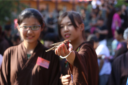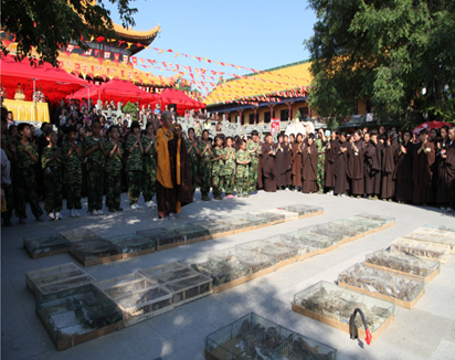 随后,在衍天法师的带领下,放生法会在三面观音像前隆重举行。念佛、诵经、洒净、皈依、回向,放生仪规有序进行。师父们带领学员们高声唱念佛号,排着整齐的队伍把一箱箱的小鸟放归天空。一声声震心的佛号,一颗颗慈悲的心灵,一双双温暖的纤手,一对对慈祥的眼神,一只只重获自由的鸟儿……,这一切的一切组成一幅动人的画面,定格在了盛夏的果城寺。学员们在放生过程中培养了慈悲心,体会了万物众生平等一如和无缘大慈、同体大悲的理念。