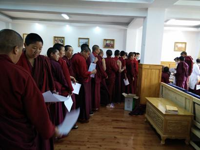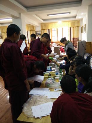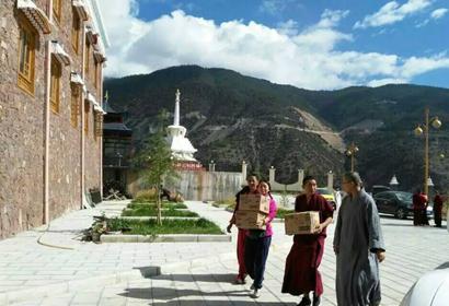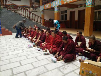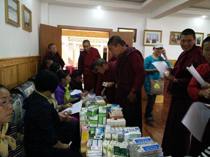 由云南省佛协、迪庆州佛协代表昆明居士、山西、北京、昆明等地居士的爱心,为每一位阿尼发放300元生活费,根据体检结果发放对治药物。并发放红糖,卫生用品、床单被罩120套等价值六万余元的生活物资。