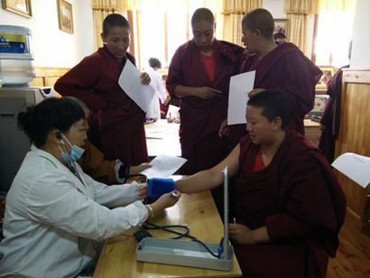 通过各项体检,慢性胃炎、沙眼、颈腰椎是阿尼们普遍的现象。有一个先天心脏病、1个甲状腺肿大,1个白内障需手术,18例心悸心律不齐,建议做心电图;16例上下腹部压痛,建议做腹部B超。几天后,将由寺院管委会统一带领需要复检的阿尼下山检查,制定治疗方案。