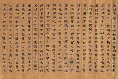 展览的30余件敦煌遗书和佛经类展品中,隋代写本《大般涅槃经》,不但首尾完整,纸墨字体俱佳,更令人称奇的是,其单纸长度均在140厘米左右,反映出隋代造纸工艺的高超水平。据国图专家介绍,敦煌遗书中纸张有如此长度者,全世界目前仅存6件。