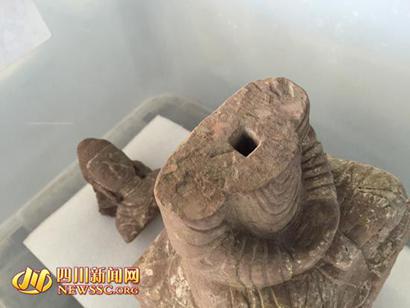 在这批修缮的佛像中,四川新闻网记者注意到,其中一尊佛像从胸部位置被一分为二,其断裂位置中心,竟早已被凿出了一个小孔。工作人员介绍,这个小孔从出土时就有,可以断定的时,这尊佛像曾经经古人修复过。“利用木隼进行嫁接,将佛像断裂的两部分结合在一起。”