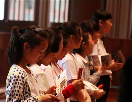 义工们同营员们一起学唱安福慈教主题歌《安福利生》