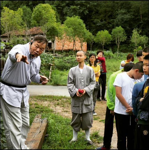 文成天圣山安福寺知客师父庆振法师带领营员们参观安福寺