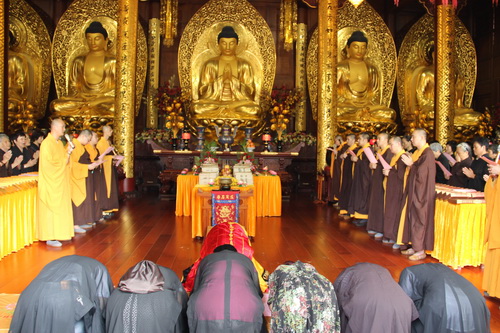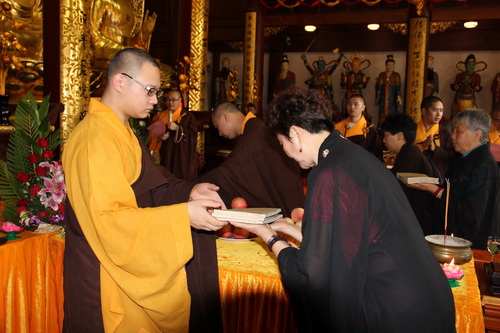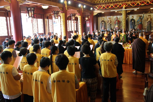 是日上午八点整,在维那师高呼本师释迦牟尼佛的佛号声中,大和尚亲自领众来到图书馆,燃香启请法宝至五方佛殿。在清净庄严的祝赞仪程中,大和尚带领诸护法菩萨恭敬至诚礼拜法宝,从自性流露出四弘誓愿,努力实践菩萨道的精神,自利利他,为“崇德、奉献、感恩、友善”道场精神更加深入人心、为“和谐社会、净化人心”的理念践行作出个体的绵薄之力。