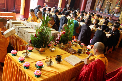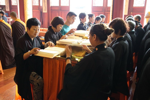 和尚开示毕,众菩萨在和尚带领之下开始翻阅经典。常言道:开卷有益。有菩萨当即表示,她阅读了到从未知晓的知识,喜悦之情,溢于言表。上午10:30,和尚领众上供,如法如仪。翻阅经典过程持续到下午四时整,众菩萨们纷纷表示:她们再次接受了三宝的加被,身心无比的轻安、欢悦,信受奉行!寺院如此的活动,以后要常态化、经常化,并真诚地祈愿社会和谐,人心安宁,法轮常转!