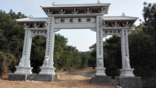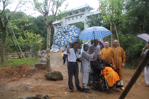 之后,众人来到伏龙山上,长老坐着轮椅,由大家推着,来到寺院山门牌楼处。牌楼上所镌楹联“缘结龙山,香火耀东南,净土千秋留胜果;梵闻甬水,法门开气象,青莲万柄证禅心。”由宁波大学叶元章教授撰写,广修长老亲书 。长老在此认真观赏, 仔细听了传道法师关于牌楼的建造过程的介绍,同时对牌楼的用材和建造工艺以及楹联的镌刻,一一点评赞赏。长老原应允4月7日出席山门牌楼的落成仪式,只是届时身体有恙,未能出席,长老一直心怀此事,此次也算践约而来。