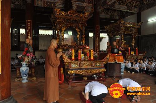 伴随着梵音袅袅的“南无本师释迦牟尼佛”圣号,全体营员跟随法师三步一拜至心虔诚地向祖殿前行。
