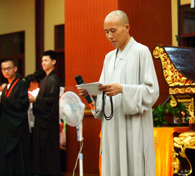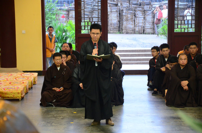 本次晚会由东林莲社负责人德凯法师和张建平居士共同主持。德凯法师首先感恩本寺方丈大安大和尚和各位常住师父为夏令营辛苦付出。德凯法师感叹:今生几何、生命安在?我们盲目地走在大路上,看不到指路的明灯。德凯法师代表营员恭请大安大和尚在演出结束后的传灯法会上,为大家点亮莲花心灯,随后德凯法师宣布演出交流正式开始。