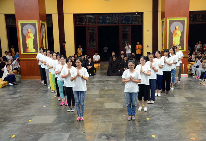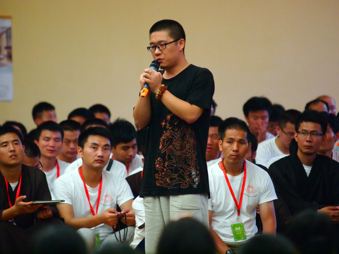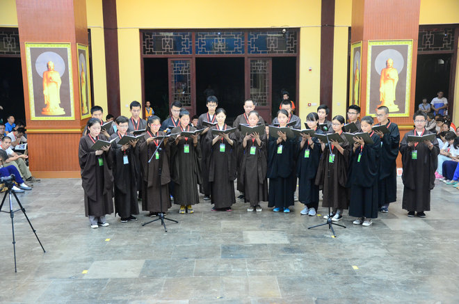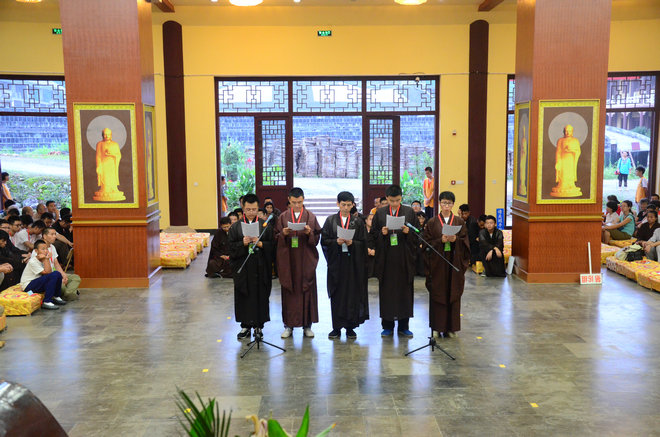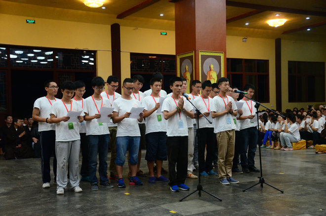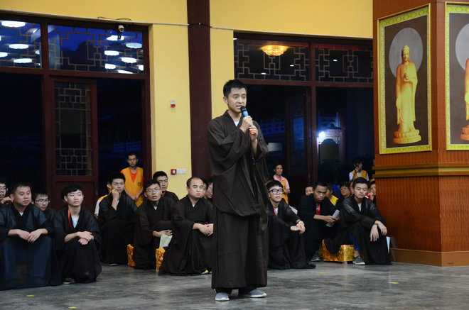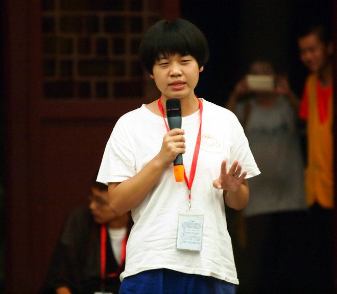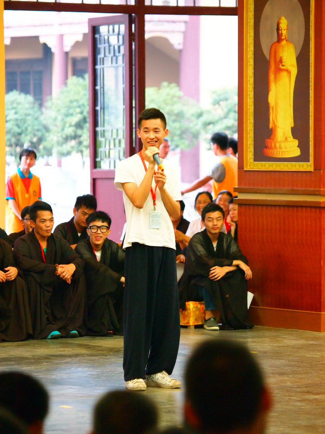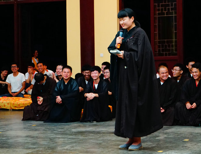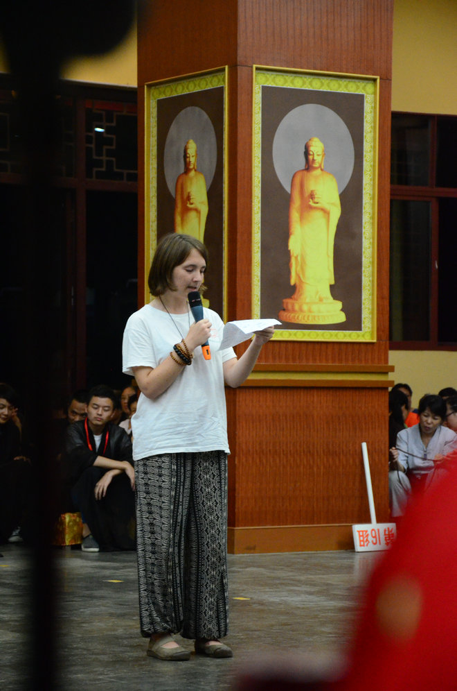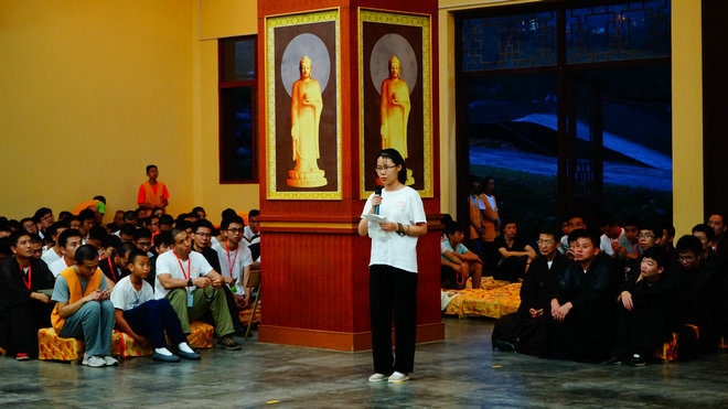 在接近3个小时的演出交流中,多位营员上台畅谈自己参加本次夏令营的深刻感悟。他们有的刚上大一、有的考研失败、有的正值事业起步。佛法的智慧或带他们走出当前的困境,或为他们指明未来的方向,每一个人都受益匪浅!在这次夏令营中,还有一位来自美国加州的营员,现就读于北京大学,也上台和大家交流了心得体会。这位中文名叫潘琳娜的异国朋友,受祖庭佛法的熏陶,已经皈依,法名慧琳。