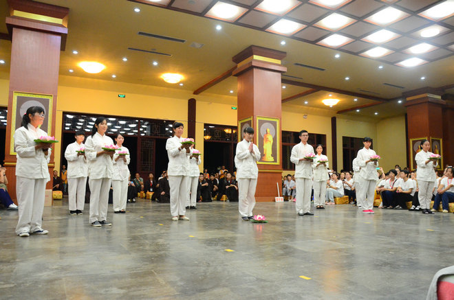 在接下来的传灯法会中,大安法师点亮了第一盏莲花灯。而后,各位出家师父和营员手中的灯次第点亮。德凯法师带领营员读诵《供灯发愿文》。在朗朗佛号声中,营员们手捧莲灯,走出香光讲堂,到大雄宝殿前供灯。愿点点灯光照亮在场每个人的心灵,带领我们走向美好的未来,走向生命的圆满与解脱……