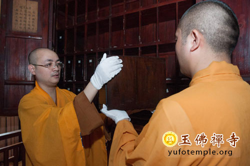 简短的法会仪式过后,法师、居士在工作人员的配合下,把玉佛禅寺珍藏的经书请出,细心除去灰尘,并轻轻翻动防止霉变与虫蛀。藉此表达对佛陀教法,特别是“法宝”的敬重之情。