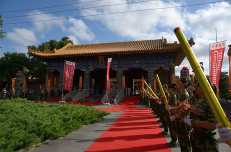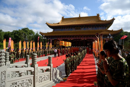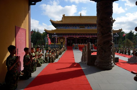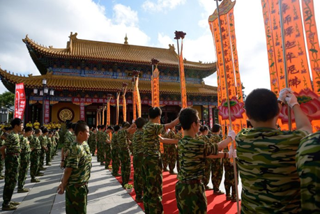 上午9点,青年学子身穿统一迷彩服安然有序地来到三圣殿,平静安详地等待嘉宾和领导亲临现场出席开营典礼。在学子们的热烈掌声中,领导嘉宾们陆续入座。