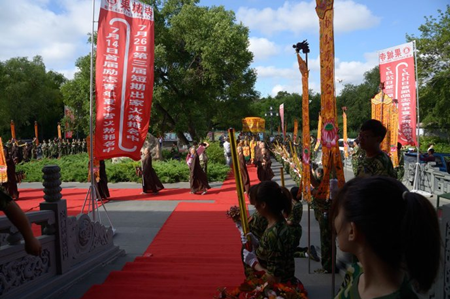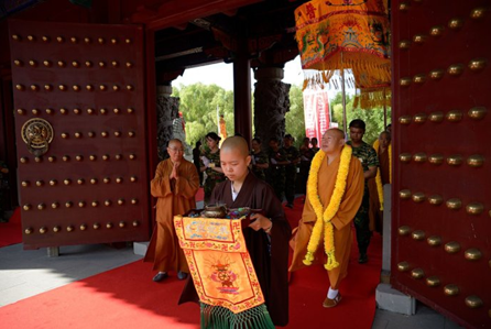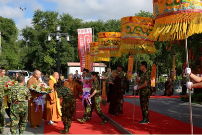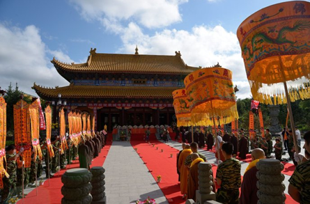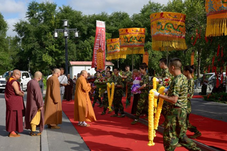2015年7月14日,阳光如金,天空如洗。大庆果城寺南山门外,馨香仪仗、钟磬齐鸣, 300多名来自各地的禅修夏令营学子整齐地排班列队,迎请参加开营仪式的嘉宾和领导:中国佛教协会副会长、黑龙江省佛教协会长、哈尔滨佛学院院长静波大和尚,黑龙江省佛教协会常务副会长天台宗第46代传人、汉地大般若第三代传人、黑龙江省双鸭山市九峰禅寺住持、双鸭山市佛母山开山住持正开大和尚,黑龙江省佛教协会副会长、大庆市佛教协会会长本英大和尚,沈阳北塔寺、大庆正洁寺及四川理塘县下坝嘛通寺法台、四川理塘寺第九十三代法台夏坝仁波切,和黑龙江省及大庆市佛教协会的相关领导。学员们虔诚地向各位嘉宾敬献曼陀罗花环,现场充满一派祥和喜庆的节日气氛。