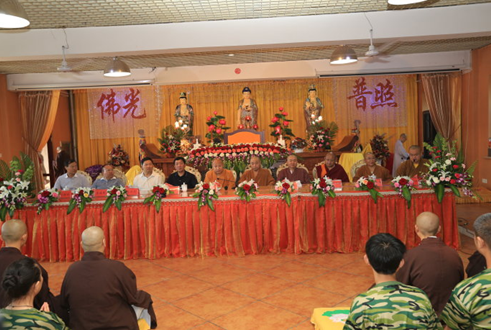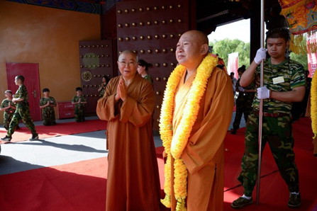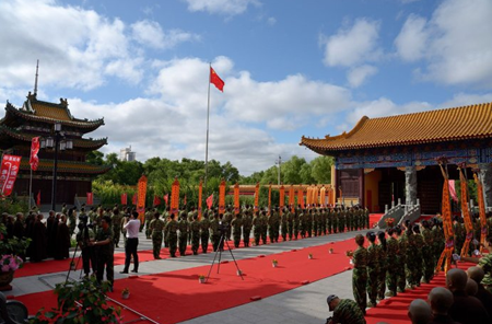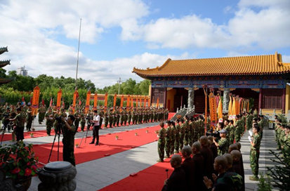 迎请结束后,学员们整齐列队在天王殿前。庄严的国歌和神圣的三宝歌萦绕在整个寺院上空,国旗和佛旗冉冉升起,学员们心中充满了拳拳爱国之情和切切修道之心。他们在心中暗自发愿,一定要为国旗增辉,为佛旗添彩,为社会做出年青人应有的贡献!