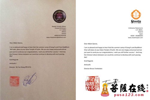西班牙少林文化中心、雅典少林发来贺信预祝夏令营活动圆满成功