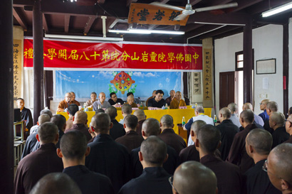 中共苏州市委统战部副部长、市民宗局局长金建立;江苏省佛教协会副会长、苏州市佛教协会会长普仁法师,江苏省佛教协会副会长兼秘书长秋爽法师等出席开学典礼并讲话。