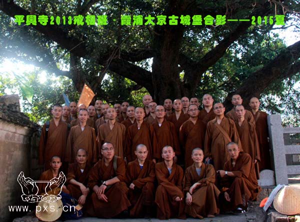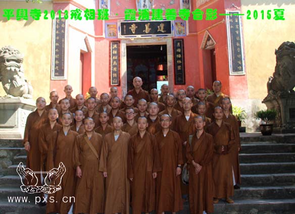 2015年8月6日,农历乙未年六月廿二早斋后,平兴寺2013级戒相班的全体学僧身著长褂、搭木兰色衣,陆续来到“普隐戒坛”广场前准备“行事钞”结业合影。