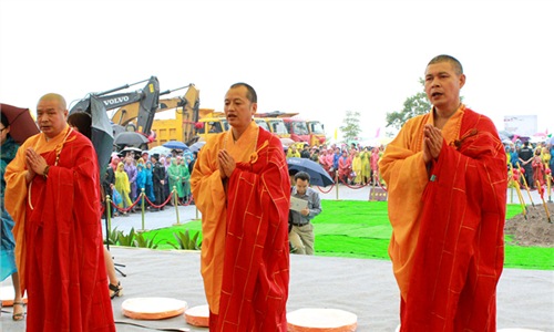 上午10时,洒净奠基仪式正式开始,胡珍强主任主持奠基仪式。重庆市佛教协会副会长道坚法师主法拈香,在道坚法师的带领下来自华严寺的二十多位法师共同礼佛诵经,按照汉传佛教仪轨诵念《心经》、《大悲咒》和《土地咒》,接着举行了洒净和奠基仪式。