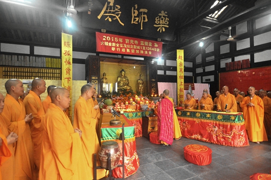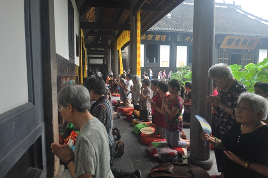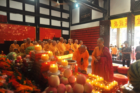 2015年8月14日(农历七月初一)四川省成都市新都宝光寺隆重举行盂兰盆法会。庄严的药师殿内,安百味饮食及各种花果盛于盂兰盆中,以供养十方诸佛及自恣僧。宝光寺克仁法师领众于法堂内礼拜《地藏菩萨本愿经》。众多居士、香客、信众以恭敬心、孝顺心、慈悲心、平等心莅临法会诵经、供僧、消灾祈福。