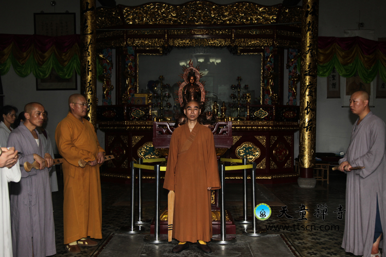 2015年8月16日,第二届天童山传统禅七起七仪式在天童禅寺卧佛殿即东禅堂顺利举行。浙江省佛教协会副会长、宁波市佛教协会会长、天童禅寺方丈诚信大和尚主持本次起七仪式并作了精要开示。