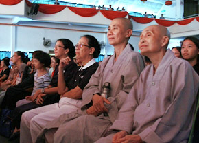 自马六甲竹林净苑的常发法师(右二)对将佛典故事改编成浅显易懂的儿童剧,传达正确的价值观,深表赞叹。(图片来源:慈济基金会 摄影:黄玉花)