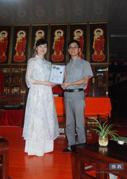 香港职业教育技术认证协会给德静茶艺大讲堂颁发国际茶艺专家证书。(图片来源:凤凰佛教)