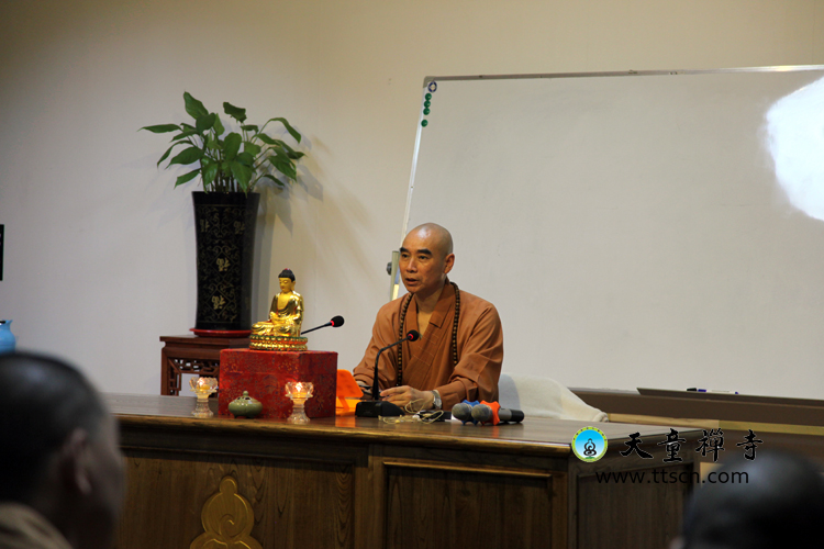 在开示中,诚信大和尚首先回顾了天童禅寺的历史地位和影响。他指出,天童历史上不仅以出了中日两国十八位国师(中国十位、日本天皇敕封八位)而闻名,更以出了众多默默无闻的清修者而著称;近代亦有八指头陀寄禅敬安、太虚大师、圆瑛大师这样的佛门大德或挂锡或学修于此,以致于有研究近代佛教的人士发出“近代佛教的中心在宁波,而宁波佛教的中心在天童”这样的感慨。随后,大和尚以中佛协原会长赵朴初老居士“培养人才”的重要性为切入点,着重指出实修与教理相辅相成的关系。大和尚说:“天童禅寺的师父们历来以坐禅著称,但是正如赵朴初老居士生前所说的,新时期弘扬佛法,既要尊重传统,又要与时俱进。只有坐禅实修的师父们也能够讲经说法,才能使社会上的人士对我们僧众另眼相看,从而更好的服务社会、利益社会。”