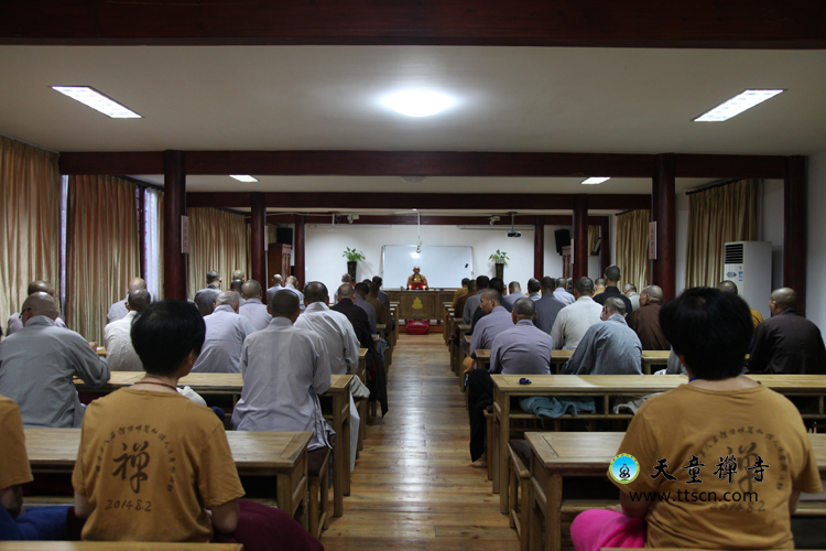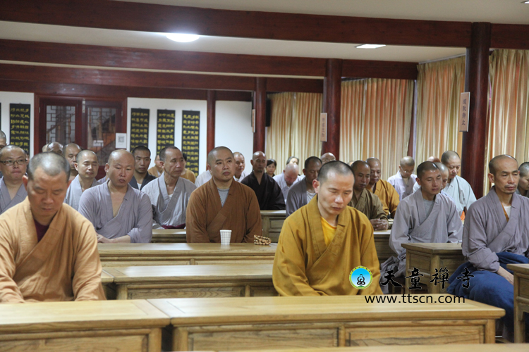 8月22日晚5时30分,宁波天童禅寺在返照楼教室举行僧伽培训班开班仪式。浙江省佛教协会副会长、宁波佛教协会会长、本寺方丈诚信大和尚在开班仪式上做了重要开示。在正式上课时大和尚又领众再次学习了《宗教事务条例》以及传达了国宗局和中佛协领导的讲话精神。
