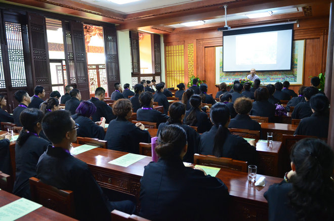 10点,学员们来到观音殿二楼教室,首先同声恭唱《三宝歌》,随后聆听了本次活动的第一堂课——德一法师主讲的《东林寺的历史与净土文化》。德一法师开示说,东林寺秀挹庐山,钟灵毓秀,历史悠久,文化底蕴深厚,自东晋年间慧远大师开山至今已有1,600多年的历史。昔慧远大师以其睿智卓识将东林寺发展为当时南方的信仰与文化中心,复与诸位高贤建斋立誓,启建莲社,遂使东林寺成为我国第一净土道场,流风余韵,影响深远。历代文人贤士与东林寺多具胜缘,留下了数不清的雅事鸿影,诗词华章。德一法师继而勉励学员们说,净土法门为浊世津梁,胜异方便,大家当放下尘缘,打开心量,在祖庭虔心领受奉行净土文化,为最终解脱生死打好基础。
