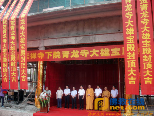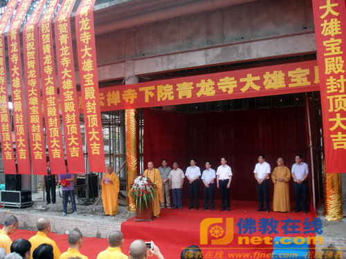 在封顶仪式上,江苏省佛教协会副会长、淮安慈云禅寺方丈、青龙寺住持果光法师、施工单位代表、淮安市佛教协会施永祥副会长、市民宗局局长许夕保分别讲话。最后,淮安市政协副主席、统战部部长仲波宣布慈云寺下院青龙寺大雄宝殿封顶。