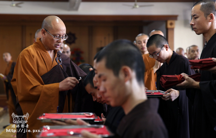 剃度仪式于早斋后在卧佛殿举行,六时三十分左右,剃度仪式正式开始。维那师举炉香赞,二师拈香礼佛后,五位净人一一上香礼佛,二师升座。其后剃度者在引礼师的带领下,作礼跪拜、至诚请师、阿阇梨策导,并最后一次遥拜父母,以报生身和养育之恩。