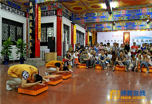 入到佛门,首先要学习佛门礼仪。两位高大帅气的年轻男居士为信众们演示了佛门的基础礼仪——合十、问讯、礼拜。