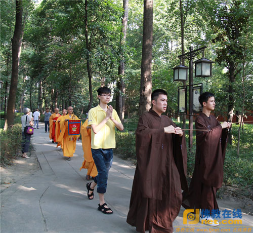 九点正,引礼法师、居士及求受皈依的信众代表,排班而出,前往西花园恭请文殊院西堂堂主本一法师,为380位信众授三皈依。