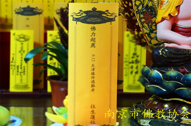 南京栖霞寺、灵谷寺、毗卢寺、鸡鸣寺、清凉寺、高座寺等寺院第一时间敬设往生莲位,举行超荐法会,上供祝祷,为8.12天津爆炸事故幸存者祈福、罹难同胞超度。