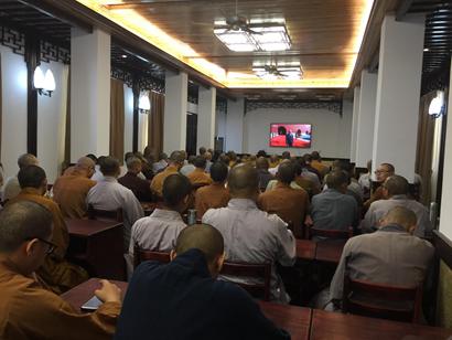 明老从始至终目不转睛,以身示范爱国爱教,让师生们倍加尊重。明老语重心长地说,纪念会值得观看,佛教是崇尚和平、爱好和平的宗教,作为一名佛门弟子,一方面要精进修行,弘法利生;另一方面要一如既往,践行爱国爱教的优良传统,铭记历史,以史为鉴,倡导世界和平。