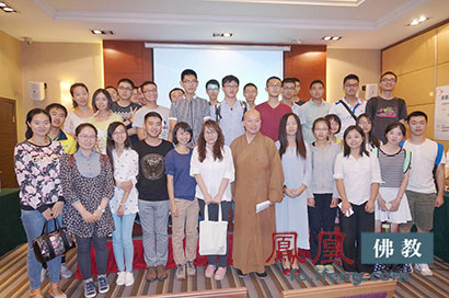 活动结束后,明贤法师、崔明晨老师与来国内外各大高校禅学社的学子们合影(图片来源:凤凰佛教 摄影:于发文)