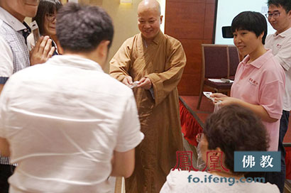 明贤法师现场抽取10张问卷为填写者颁奖(图片来源:凤凰佛教 摄影:于发文)