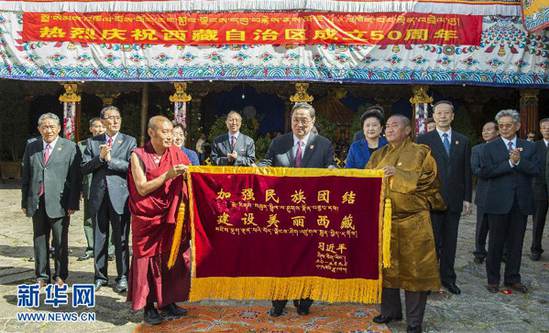 俞正声向大昭寺赠送习近平总书记亲笔题写的“加强民族团结建设美丽西藏”贺幛