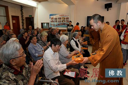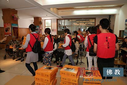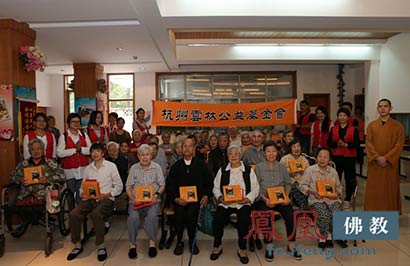 2015年9月23日至9月26日,中秋佳节来临之际,杭州云林公益基金会的法师带领云林志工团的志工们,为周浦敬老院、浙江省民政康复中心、朝晖街道工疗站、下城区老人公寓等11处的老人、儿童和残障人士,送去了灵隐寺的净素月饼,同时也送上美好吉祥的祝福。