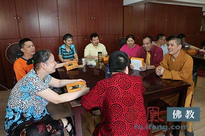 云林公益基金的法师们送上灵隐寺自制的月饼(图片来源:凤凰佛教 摄影:性恩行者 云林一叶)