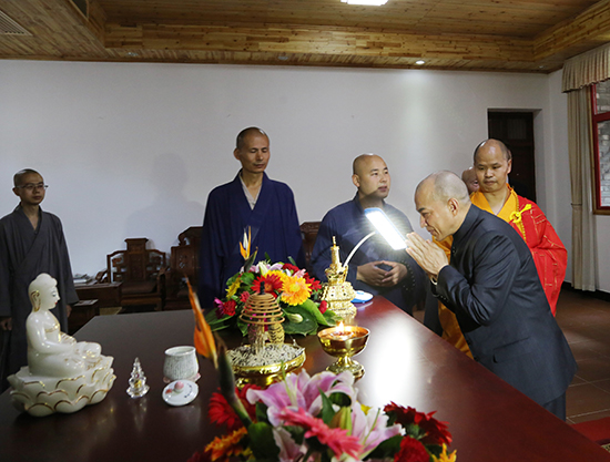 9月9日上午10:30许,云居山阳光普照,秋高气爽,真如禅寺山门大开,钟鼓齐鸣,常住两序大众、护法居士齐聚大雄宝殿,高诵梵呗,庄严迎请佛国友邦柬埔寨国王诺罗敦·西哈莫尼一行莅临云居山友好访问。诺罗敦·西哈莫尼国王一行在纯闻大和尚的陪同下在大雄宝殿上香,为中柬两国人民祈福,祝愿两国友谊源远流长,人民幸福安康,祈祷国泰民安、世界和平;随后,纯闻大和尚陪同诺罗敦·西哈莫尼国王一行瞻仰了虚云老和尚舍利,在曹洞宗二祖道膺禅师手植的千年银杏树下合影留念,并参观了虚云纪念堂、正觉苑讲堂。
