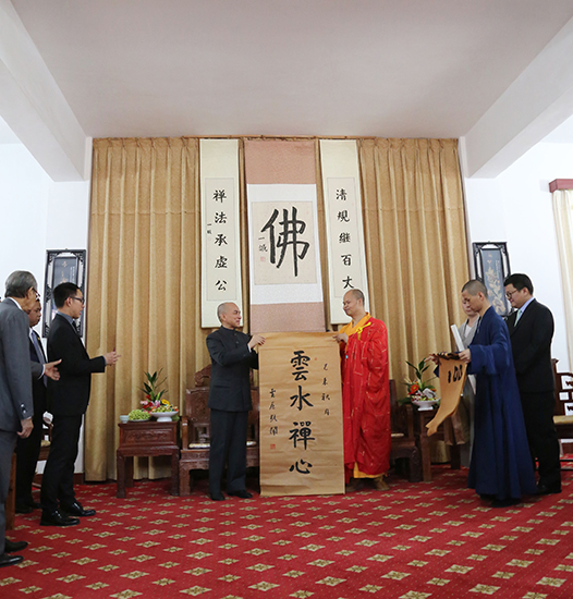 纯闻大和尚还向诺罗敦·西哈莫尼国王介绍了云居山国际禅修院的建设规划及真如禅寺的发展前景,双方亲切交谈,并互赠礼物,纯闻大和尚向诺罗敦·西哈莫尼国王赠送虚云老和尚影集、云居山真如禅茶以及墨宝“云水禅心”。11:30许,诺罗敦·西哈莫尼国王一行结束了友好访问,对纯闻大和尚的友好接待,西哈莫尼国王表示感谢,并由衷赞叹了云居山真如禅寺的纯正道风,最后,西哈莫尼国王热情邀请纯闻大和尚访问柬埔寨,双方在天王殿前合影留念。