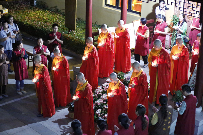 最后,有王苡婷居士主唱,曙提法师作词的“回家的路”中,大众点燃手中的莲花灯,一一相传,也把“学如来使,做同觉人,服务社会,奉献人生”的同觉精神传承下去。并在观音菩萨的圣号中缓缓传至书院广场,摆成同觉寺logo“觉”字的形状。藉此希望大家同觉,觉为大家。随后,恭请曙提大和尚、计华大和尚、妙法大和尚共同主法举行拜月仪式。大众虔诚礼拜南无月光遍照菩萨。祈祷世界和平,国泰民安。祝愿大众吉祥平安!