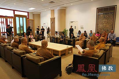 随团法师明贤法师、著名学者何方耀教授参加了座谈(图片来源:凤凰佛教 摄影:妙传)