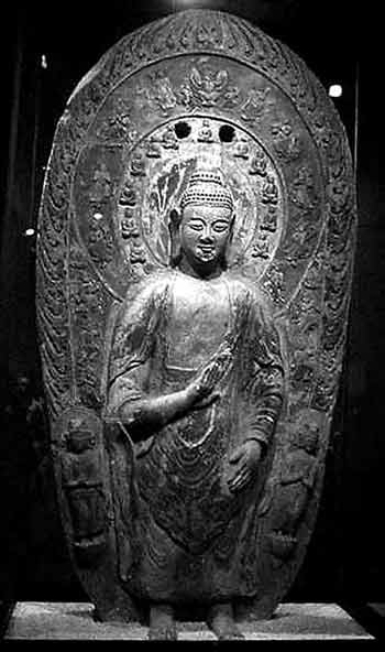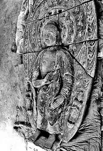 专案侦破组只能从录像和照片上认识北魏石佛,这是一尊释迦牟尼佛造像,通高2.2米,由一整块花岗岩镌刻而成,雕工精细,技法娴熟,线条流畅。佛头顶为螺形发簪,面部丰满、端庄、含蓄、慈祥,双耳垂肩、神态自如。身后为圆形大背光,背光上分层刻有忍冬纹、火焰纹和31尊歌舞伎,造型生动,形态逼真。背光后上半部有12排小佛像。