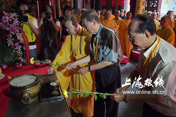 2015年9月3日讯,为庆祝中国人民抗日战争胜利暨世界人民反法西斯战争胜利七十周年,今天上午,上海玉佛禅寺隆重举行了系列纪念活动,并邀请两位抗战老战士来到现场,共同缅怀先烈、祈祷和平。全国政协委员、中国佛教协会副会长、上海玉佛禅寺方丈觉醒法师与两位85岁高龄的抗战老战士:西藏军区总医院原院长周志先、海军东海舰队原五七干校校务部副部长陈友仁,一同来到大雄宝殿前,纪念仪式正式开始。