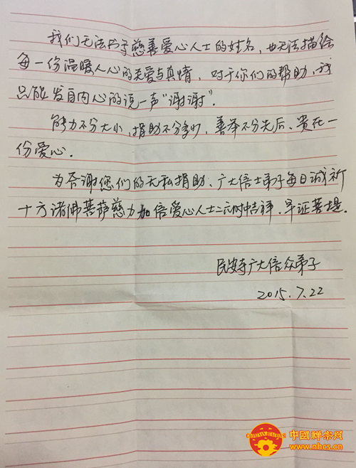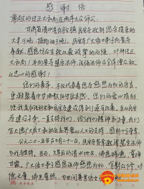 为表示对传正大和尚及南华禅寺常住的感谢,民安寺众善心特寄来感谢信一封,感谢南华禅寺的爱心捐赠,感谢传正大和尚的慈悲善举。